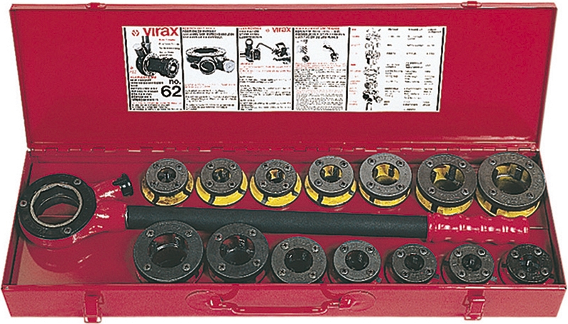 Клупп ручной Virax 3/8"-1/2"-3/4"-1"-1 1/4" BSPT Правая и Левая (Виракс 3/8"-1/2"-3/4"-1"-1 1/4" БСПТ Правая и Левая) – профессиональный высокопроизводительный ручной резьбонарезной набор клуппов для нарезки правой и левой конической трубной резьбы BSPT на стальных трубах Ø 3/8", 1/2", 3/4", 1", 1 1/4".